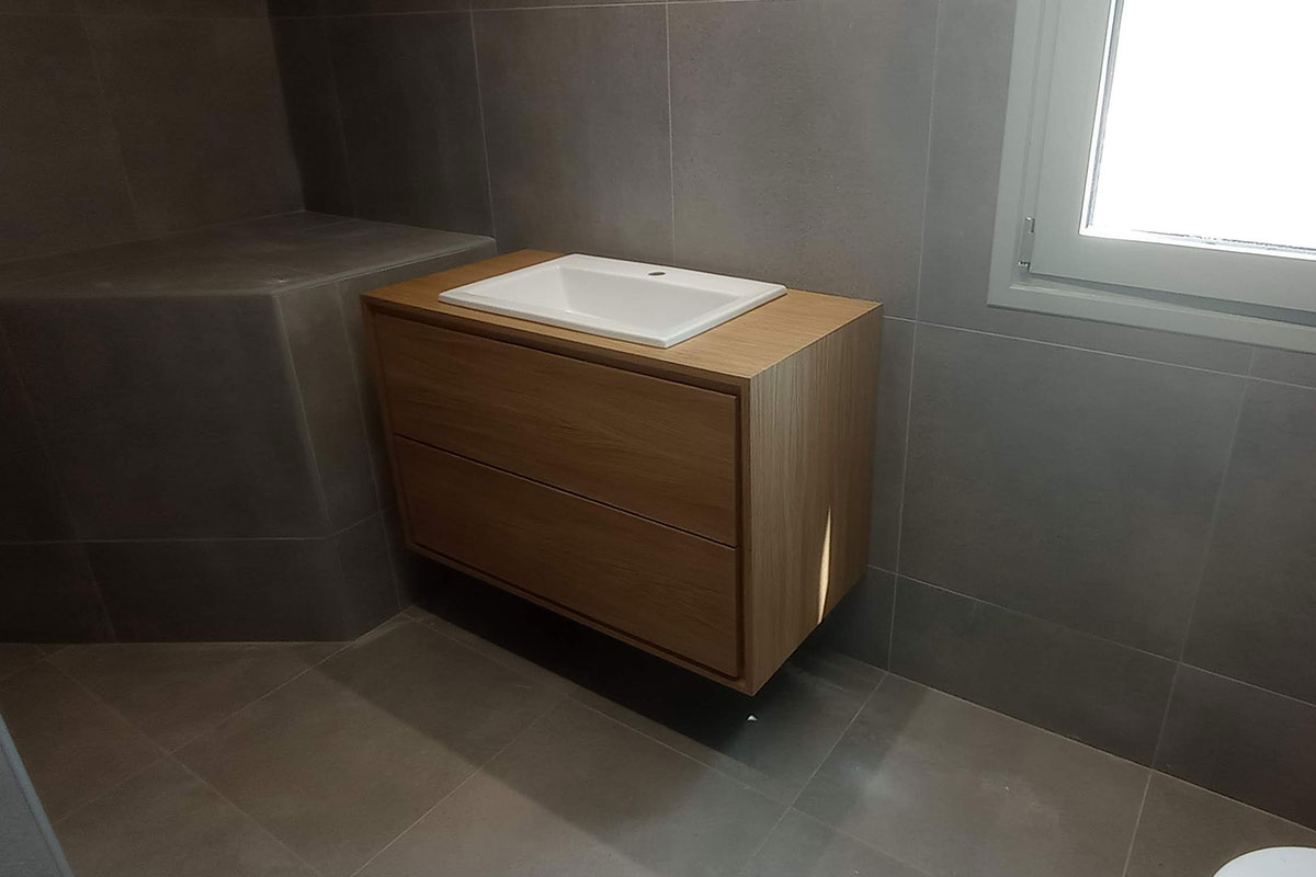 Κατασκευή επίπλου μπάνιου από φυσικό ξύλο δρυός, σχεδιασμένο για να συνδυάζει αισθητική, αντοχή και λειτουργικότητα.